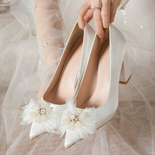 Women's Petite White Satin Chunky Heels With Bow Tie MS87